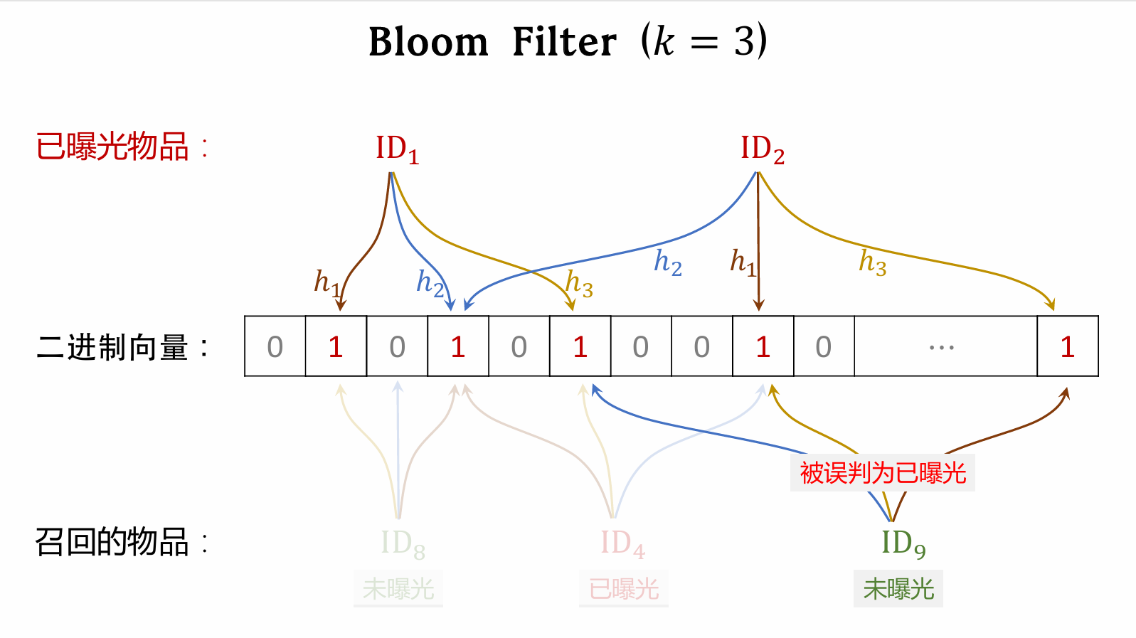 • 如果判断为 yes,那么该物品很可能在集合中。 (可能误伤,错误判断未曝光物品为已曝光,将其过滤掉。)